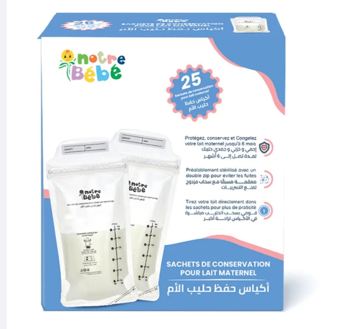 Les sachets de conservation du lait maternel Notre-Bébé sont conçus pour répondre aux besoins des mamans modernes. Pratiques, hygiéniques et fiables, ils permettent de stocker le lait maternel en toute sécurité, que ce soit à la maison ou en déplacement.