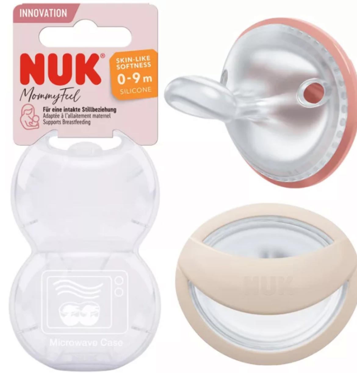 Sucettes NUK MommyFeel 0-9M : lot de 2 en silicone ultra-doux, pensées pour les bébés allaités, respectueuses du développement buccal et faciles à stériliser.